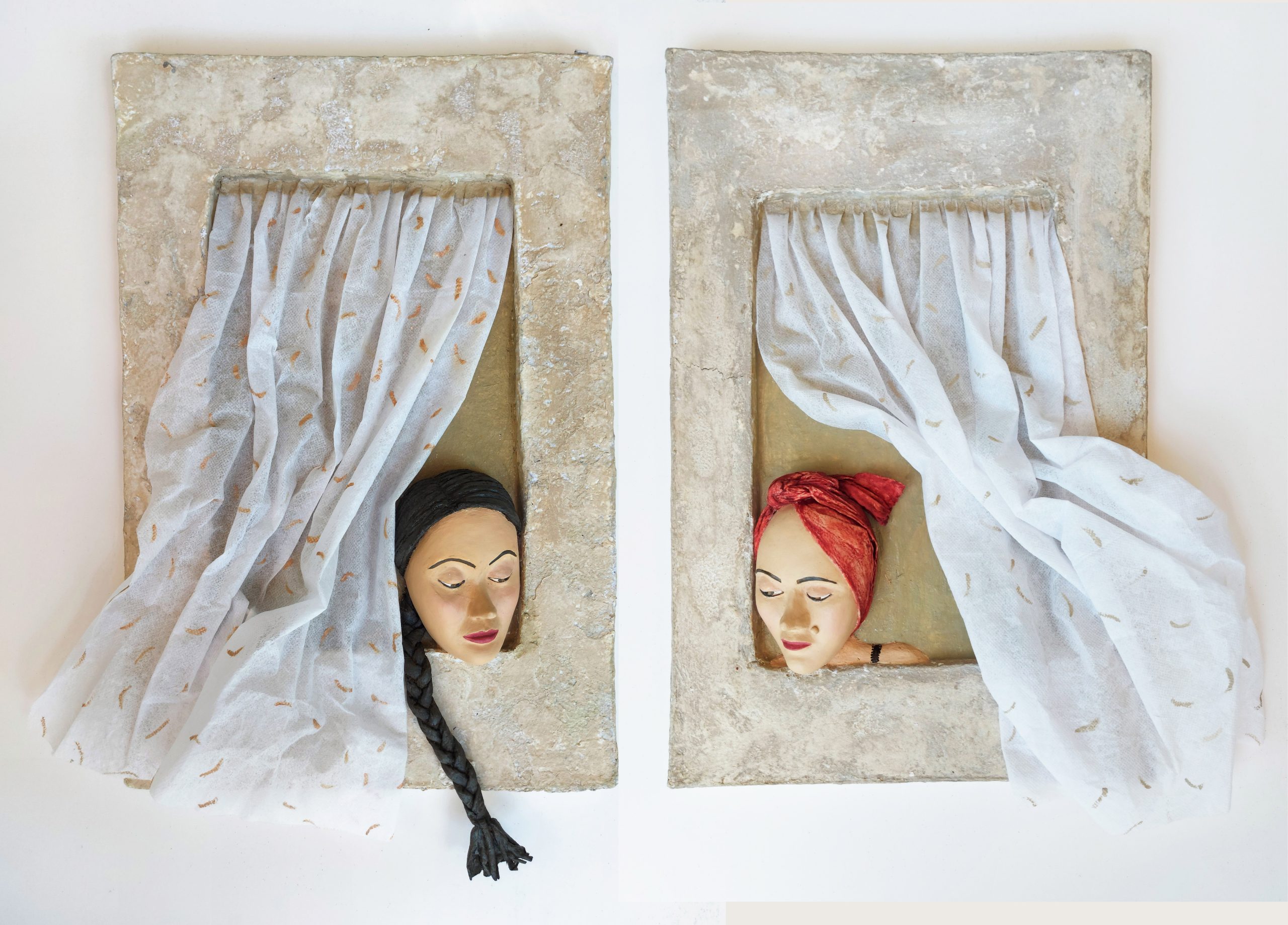 שתי נשים, תבליטי עיסת נייר, גובה 25 ס"מ | גבריאלה אייזיקוביץ'